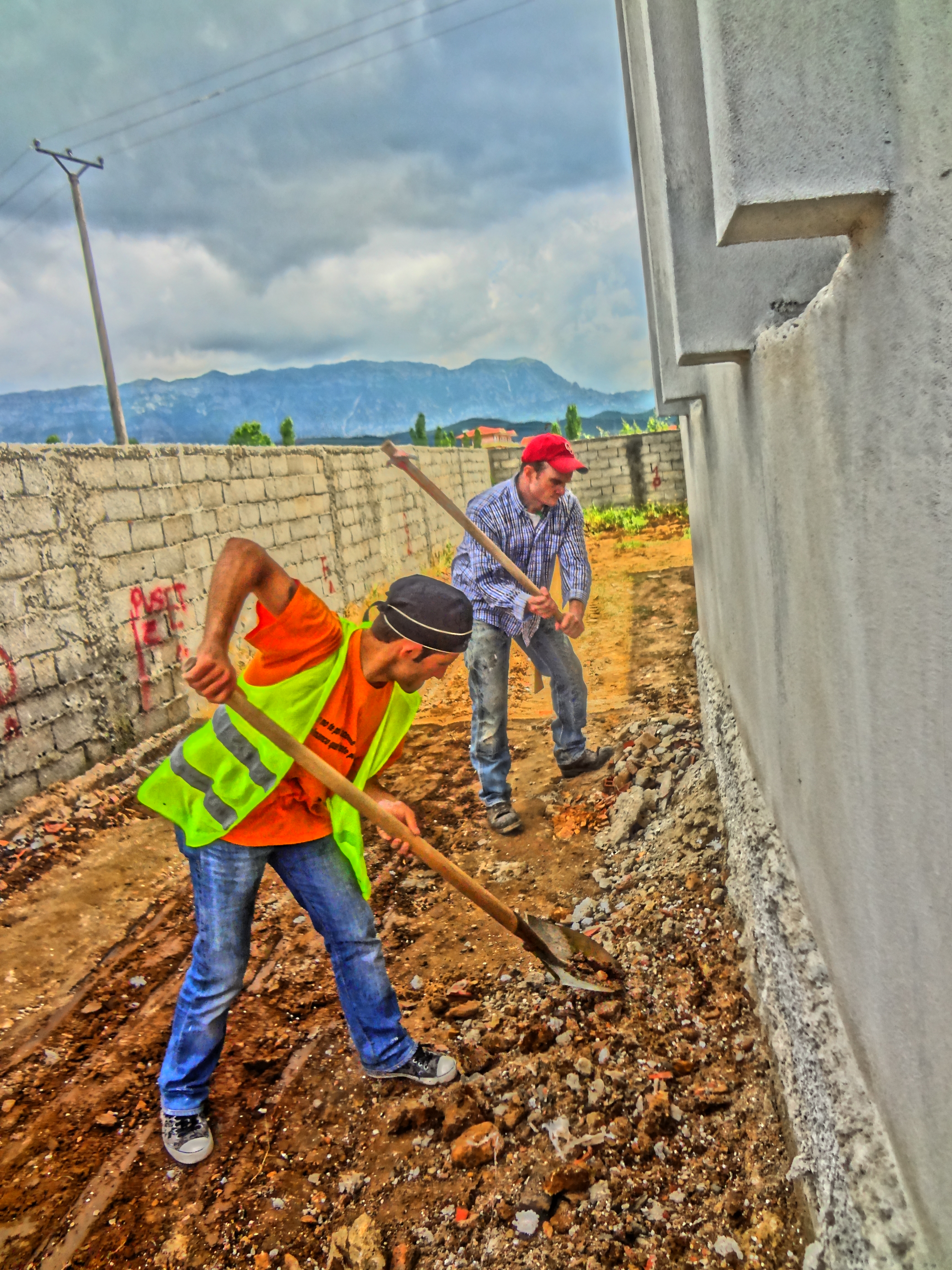 I met up with Pastor Alban at around 8:30 in the morning Jamiya e sheshi Qender Skenderbeu (at the the mosque in Skanderbeg Center). On our way to Fushkruje, we exited the furgon (minivan) early to pick up a few shovels and some other sundry tools. Soon we were on sight, helping to clear the material which had built up around the building over the initial construction phases.