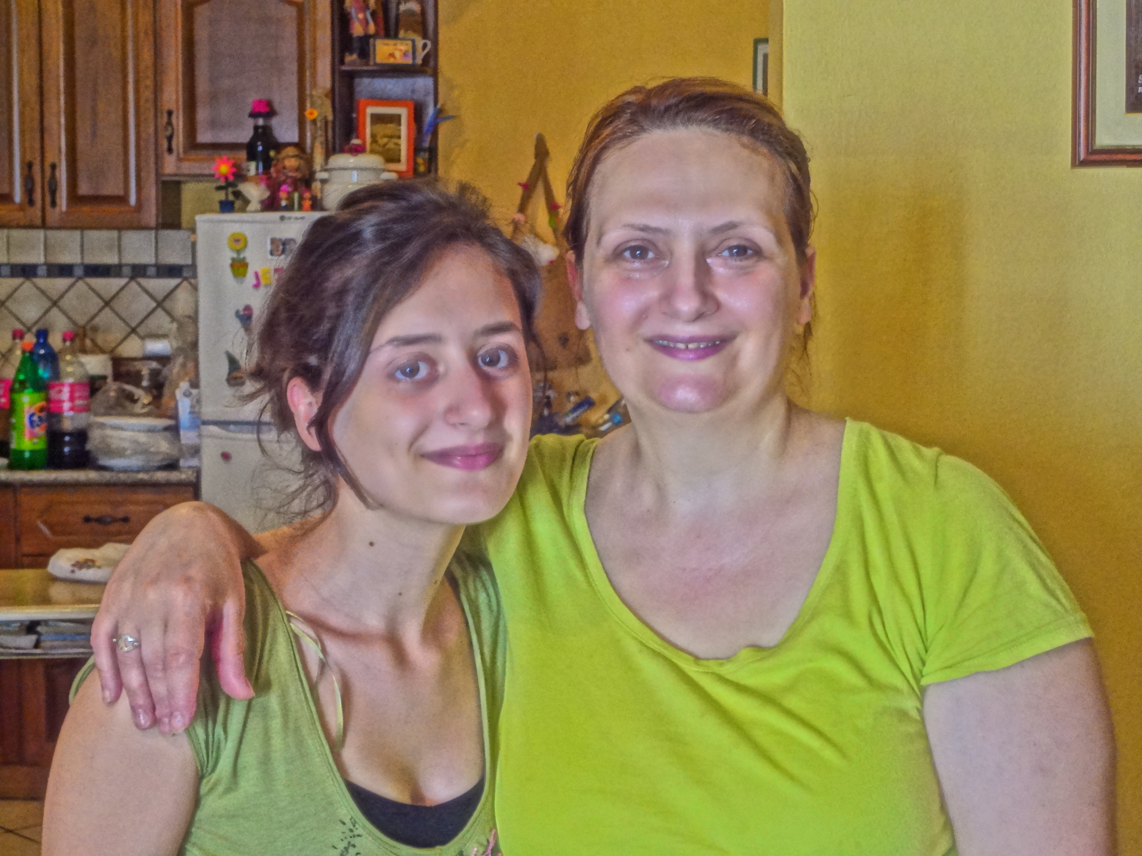 Pastor Gezim has been the thrust behind our getting deeper connections with the churches of Italy. After church in Fushekruje we went to his house to have a meal with the fifteen Italians who are visiting for the week. Perhaps growing up with a bus system which allows for no limit to the number of people who can board a motorized vehicle has given the Albanian people a higher threshold of comfort when it comes to packing into small venues. 24 of us sat and broke bread in Pastor Gezim’s 4×6 meter dining room, spilling into the kitchen. His lovely wife and daughter provided a delicious pasta as the first course. Tomato, cucumber and olive salad followed with thick slices of rotisserie, slow cooked pork. Ice cream was the finish after a brief interlude of fresh peaches and cherries. With permission, I took their picture.