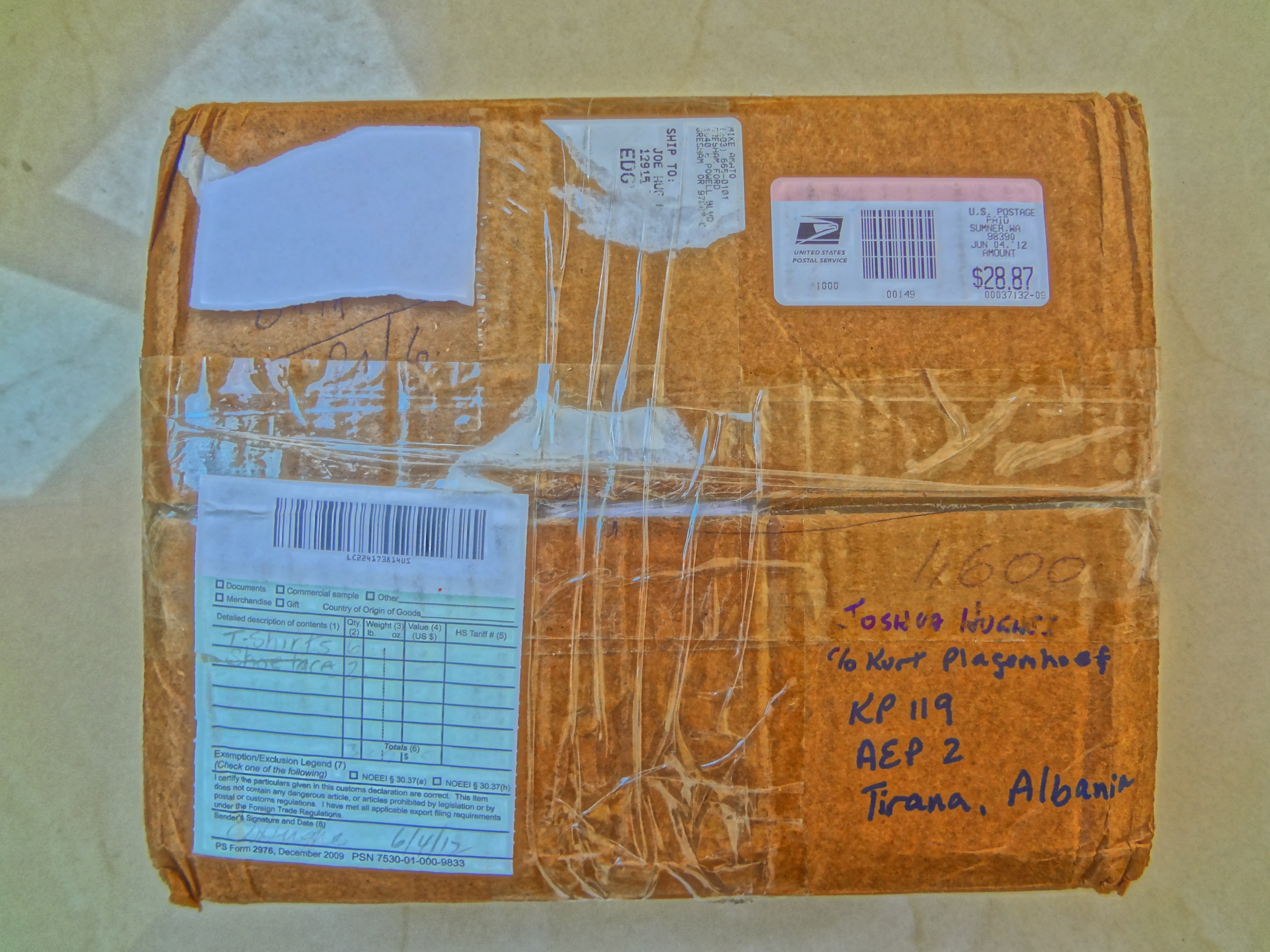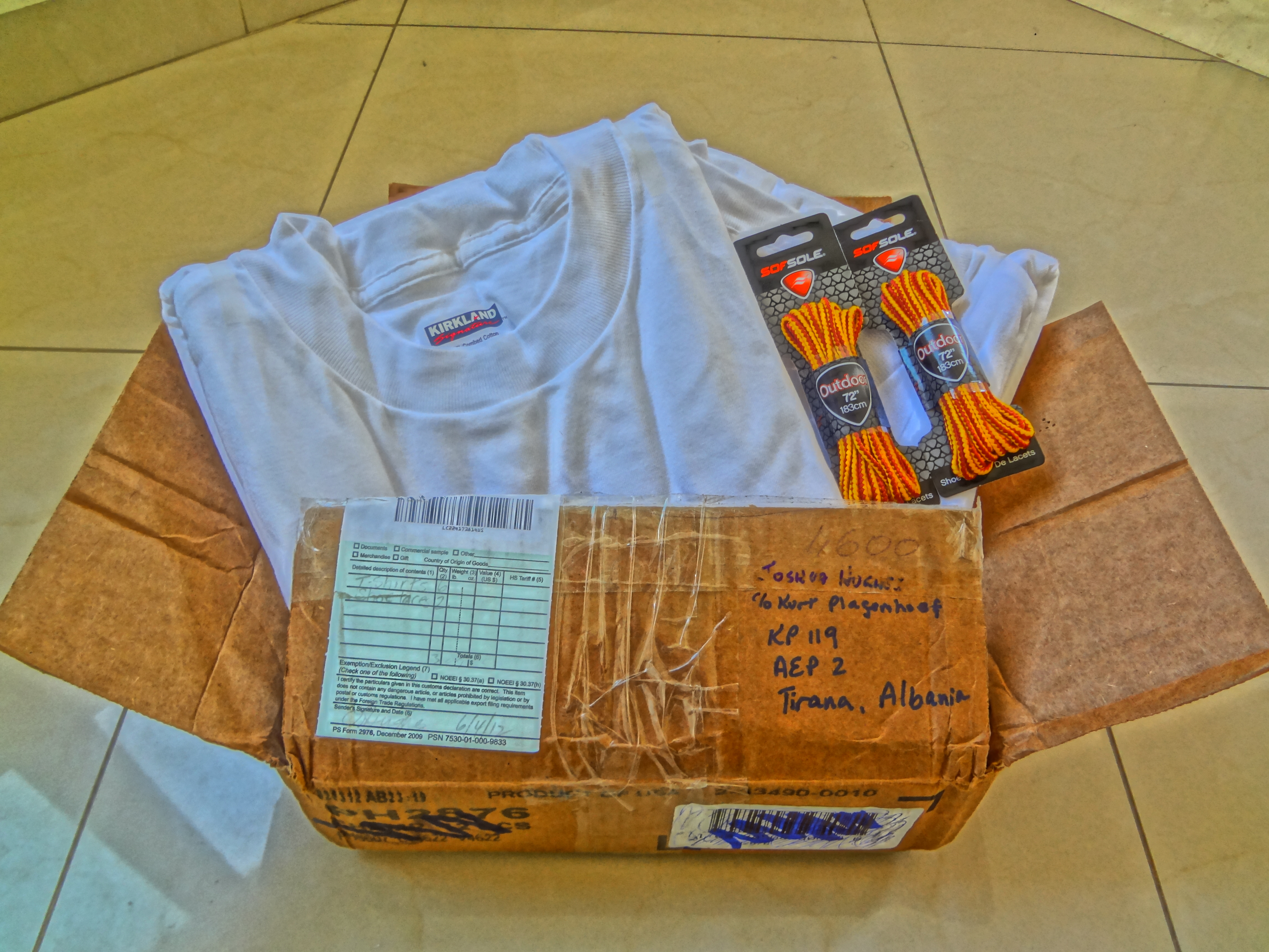 A wonderful thing happened a few day ago. I got a package from my parents. In case you were wondering, for the low price of $28.87 you too can ship six crispy-white, fresh t-shirts and a two pairs of 72″ boot laces to Albania from the States. Post marked on the 4th, arriving here on the 20th, thanks Mom and Dad.