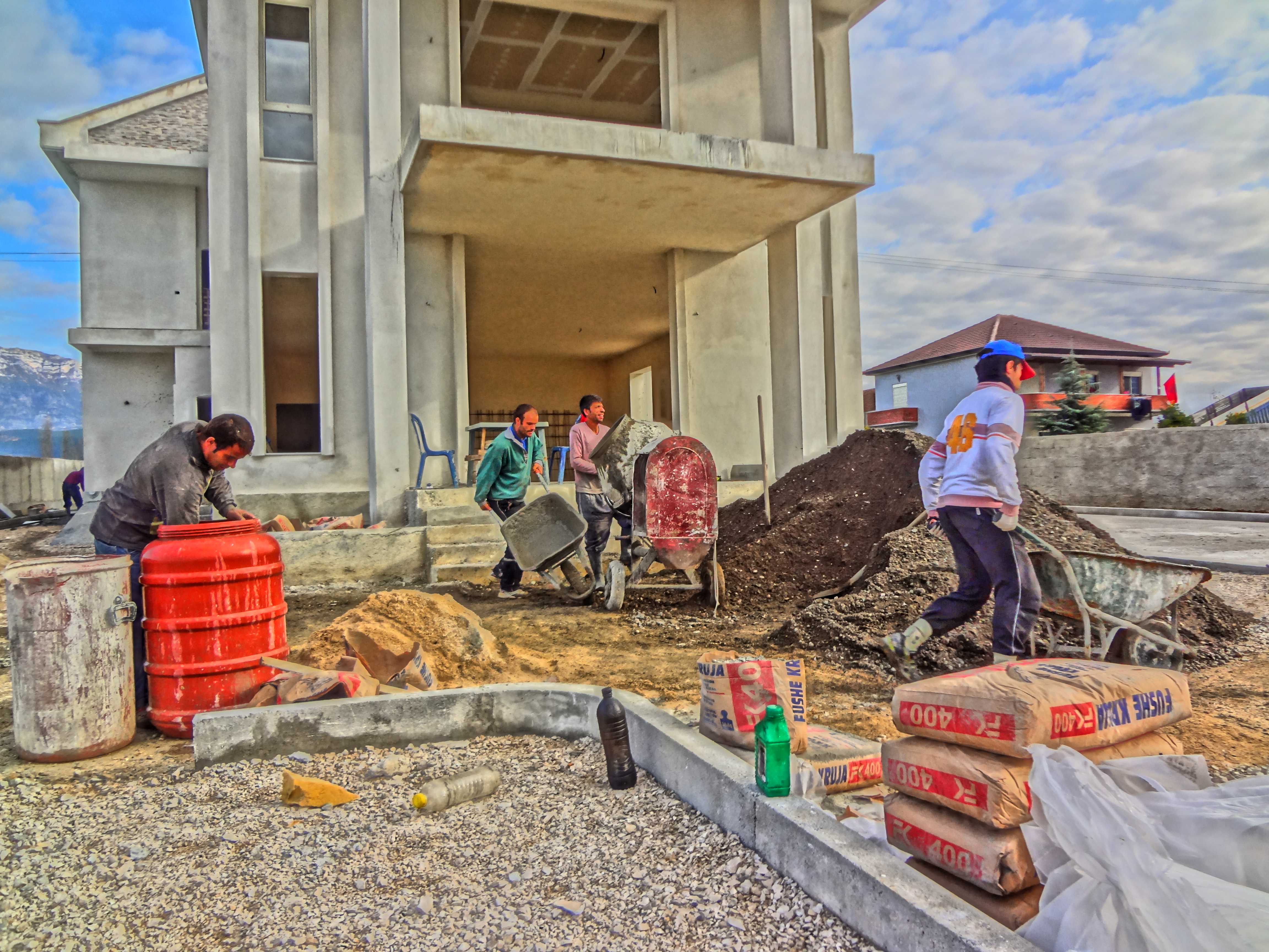 The ground has been ready to receive its 12 centimeter liquid stone shell for months. We had been on hold due to the production of a poor product by the first crew we hired. After the forms had been set for an area, the race began. Besmir cut and fit the welded-wire mesh in place, staying just ahead of the wheelbarrow men Piarin and Edison. Gazmir and Flamur never stopped hauling one bucket of water for every half bag of cement and one dozen shovel loads of sand-rich gravel to the spinning hopper of the mixer. As soon as the mixing was done, the wheelbarrows were filled and the mixing process started again.
