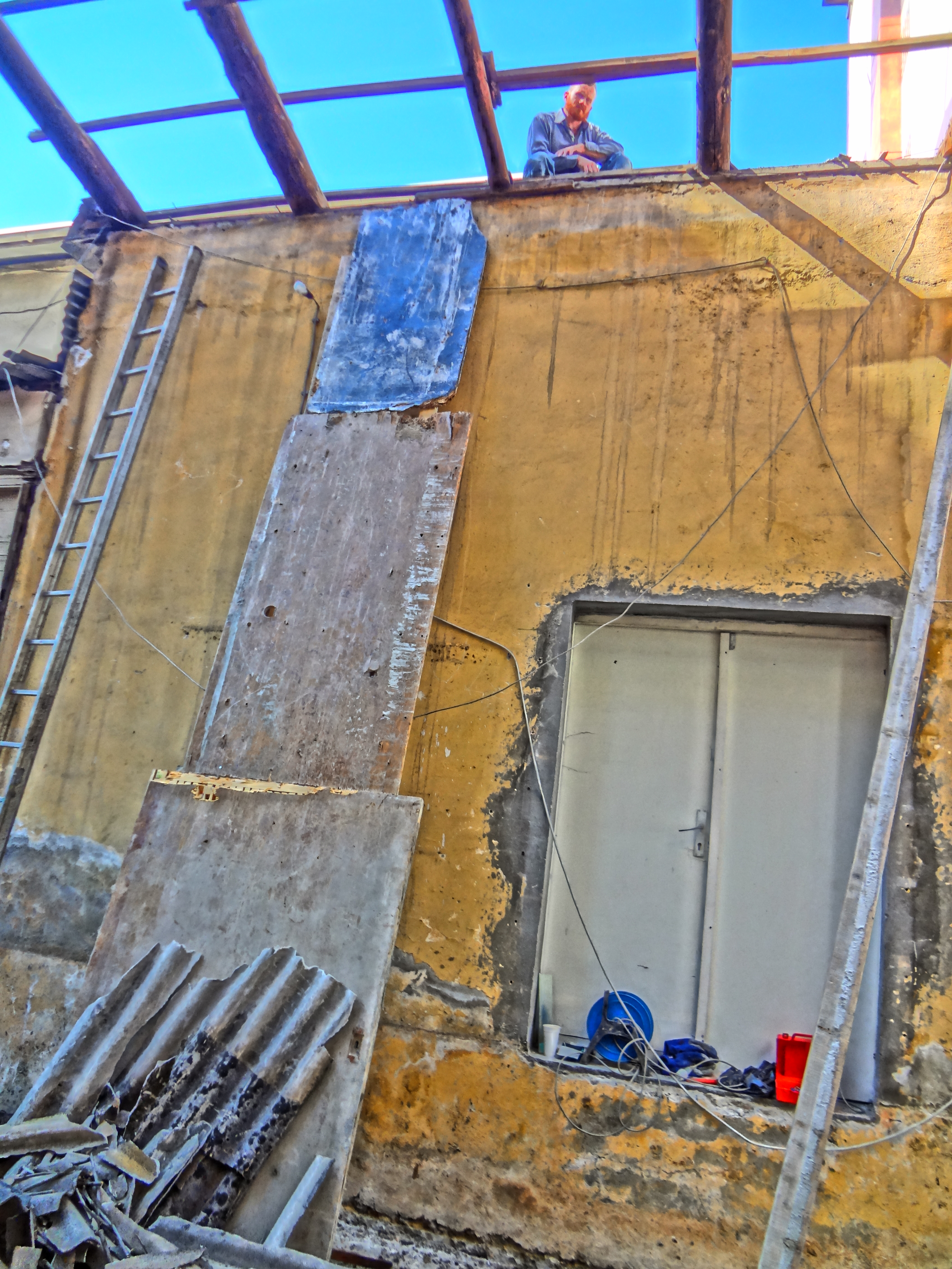 We successfully took all of the tiegula down from the existing roof today. I say successful because we did it without any fall-protection or safety gear of any kind. The only tool I used was my framing hammer. Each of the concrete embossed, asbestos tiles is about a 1.5 x .5 meters in size and weighs about forty pounds. There was plenty of margin for error, but we kept to a slow and safe method. I have always enjoyed demolishing structures.
