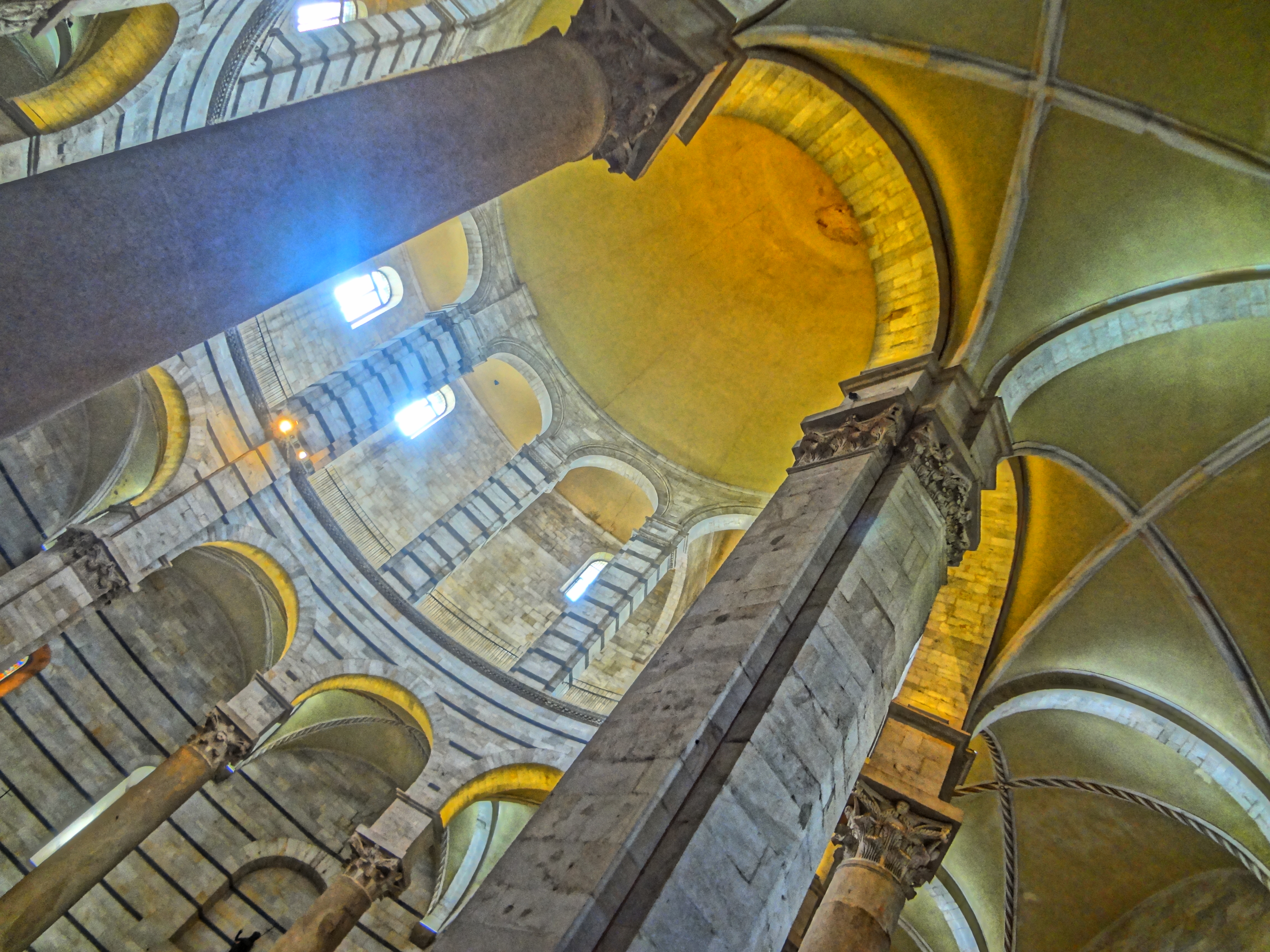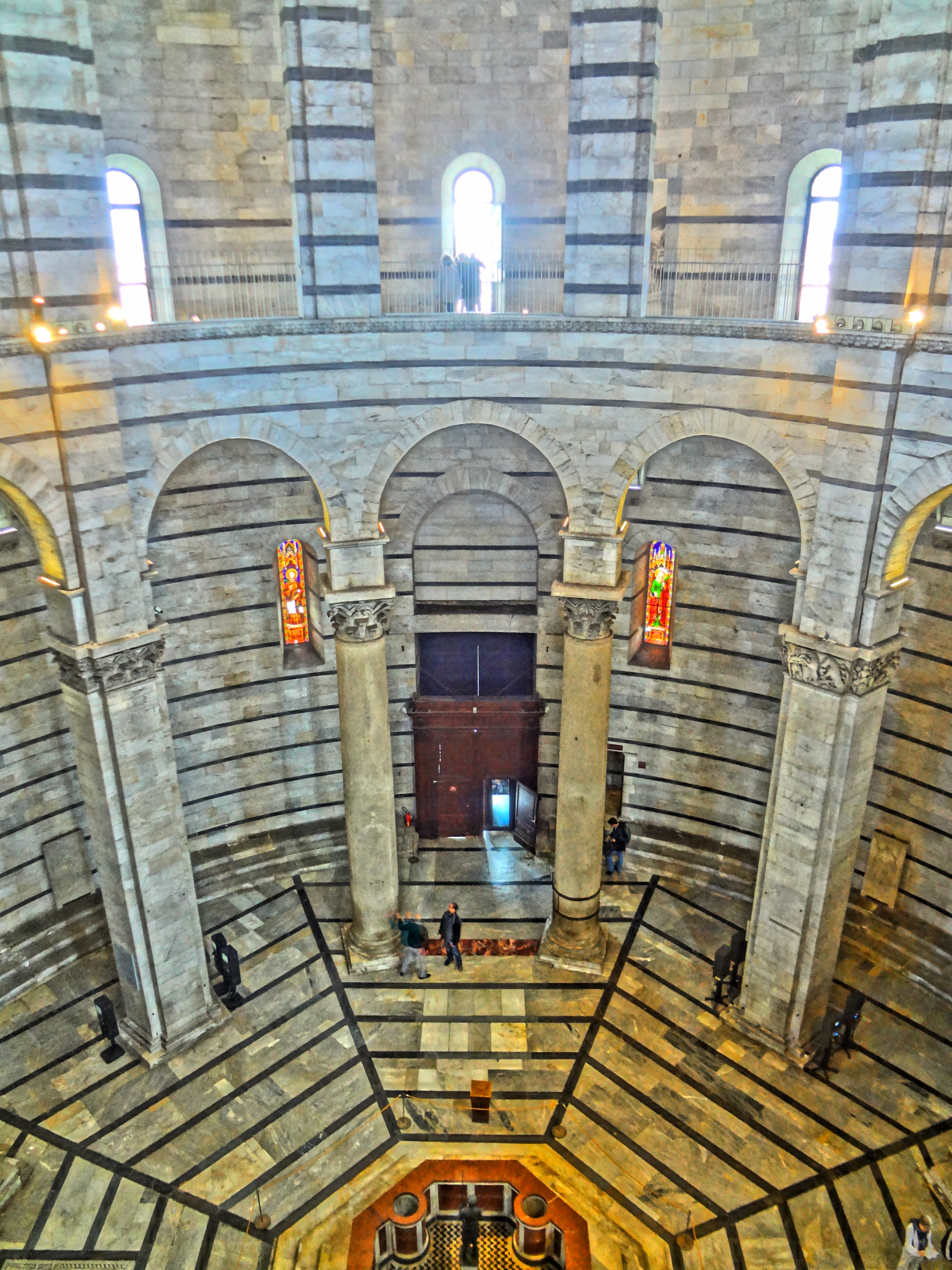 As a builder, I also found the Baptistery to be very impressive.  After making my way inside, I simply sat for a minute to get my sense for the size of the place.  It is adorned simply.  The floor has the symmetry of a spider web with lines of black which continue horizontally onto the walls, support columns, and archways.  The black stripes can also be found in other churches in Pisa and on some coats of arms affiliated with the city.